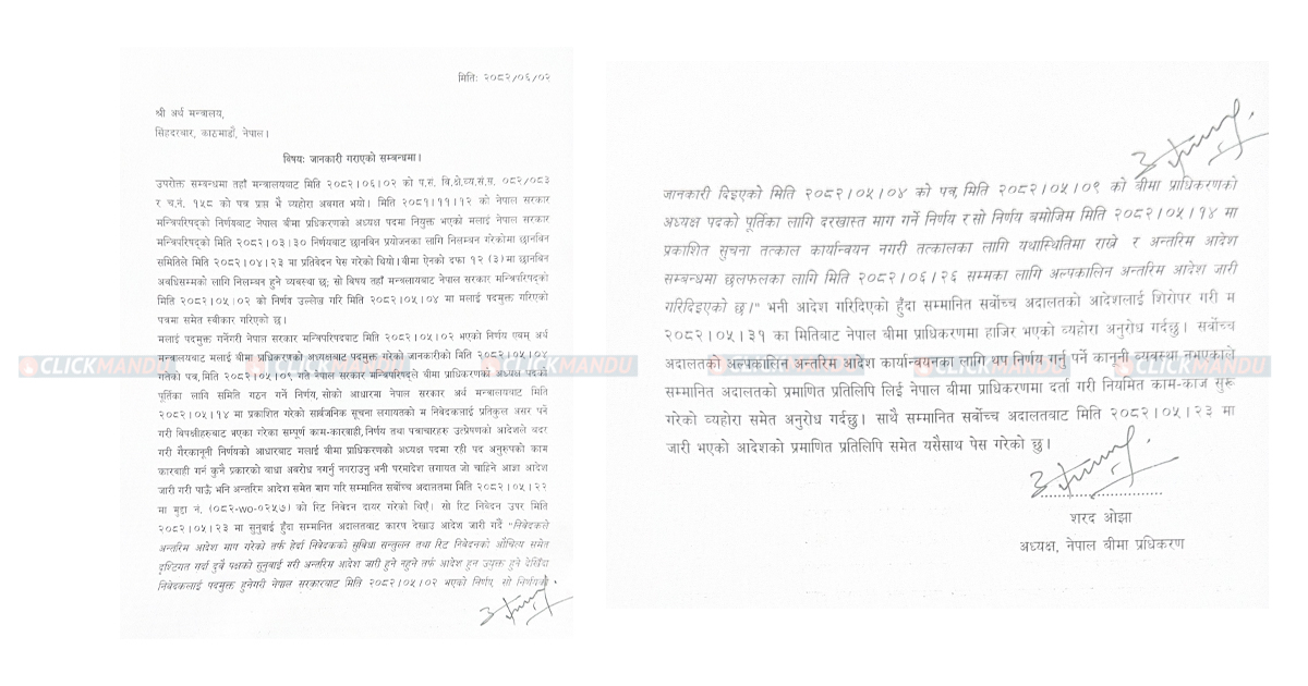 काठमाडौं । नेपाल बिमा प्राधिकरणका अध्यक्ष शरद ओझाले सर्वोच्च अदालतको अल्पकालीन अन्तरिम आदेशका आधारमा प्राधिकरणमा हाजिर भएको जवाफ अर्थ मन्त्रालयलाई पठाएका छन् ।