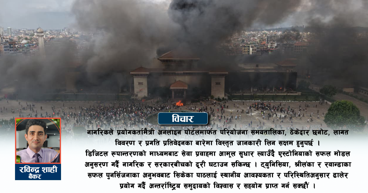 पारदर्शिता, जवाफदेहिता र समावेशी शासनका सिद्धान्तहरूमा आधारित राष्ट्रिय पुनर्निर्माण कोषको स्थापनाले केवल वित्तीय स्रोत परिचालन मात्र नगरी नयाँ शासन संस्कृतिको जग बसाल्न सक्छ । डिजिटल रूपान्तरणको माध्यमबाट सेवा प्रवाहमा आमूल सुधार ल्याउँदै एस्टोनियाको सफल मोडल अनुसरण गर्दै नागरिक र सरकारबीचको दूरी घटाउन सकिन्छ ।