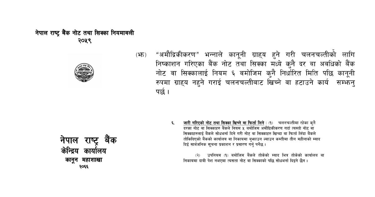 अमौद्रिकीकरण गर्नेवित्तिकै प्रतिबन्ध लगाएका नोटले कानुनी मान्यता गुमाउँछन् । ती नोट बजारमा लेनदेनका लागि प्रयोग गर्न पाइँदैन ।
