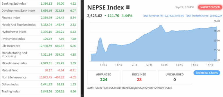 साताको कारोबारको पहिलो दिन आइतबार सेयर बजार सूचक नेपाल स्टक एक्सचेञ्ज (नेप्से) १११.७० अंक अर्थात् ४.४४ प्रतिशतले बढेर २६२३.६२ बिन्दुमा पुगेको छ ।