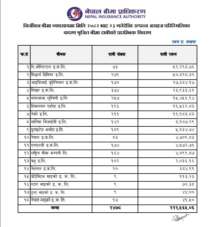 भदौ ३१ गतेसम्म २० अर्ब ७० करोड ३८ लाख १४ हजार रुपैयाँको बिमा दाबी परेकामा असोेज ५ सम्म आईपुग्दा कुल २२ अर्ब २५ करोड ६५ लाख रुपैयाँ बराबरको बिमा दाबी परेको हो ।