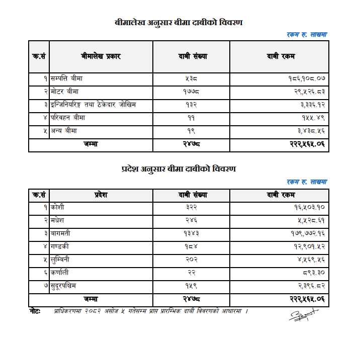 प्राधिकरणका अनुसार सम्पत्ति बिमामा १८ अर्ब ६१ करोड ८ लाख रुपैयाँ बराबरको ५३८ वटा बिमा दाबी पर्दा मोटर बिमामा २ अर्ब ९५ करोड २६ लाख रुपैयाँ बराबरको १७७८ वटा बिमा दाबी परको छ ।