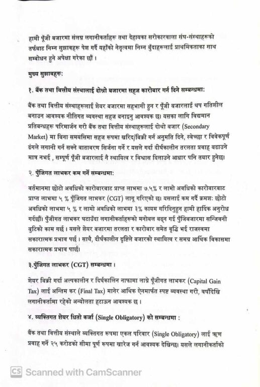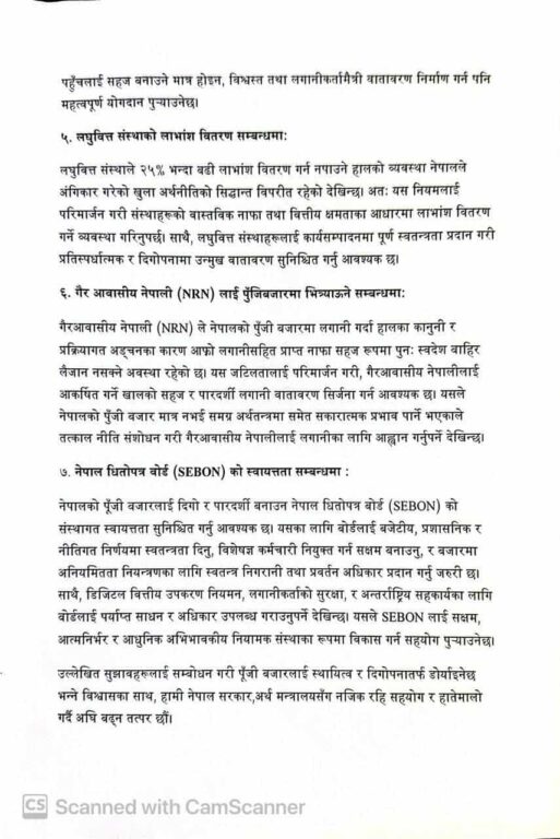उनीहरुले नेपाली पुँजी बजारमा गैर आवासीय नेपाली नागरिकलाई भित्र्याउने कार्यमा जोड दिन अर्थमन्त्रीसँग आग्रह गरेका छन् ।