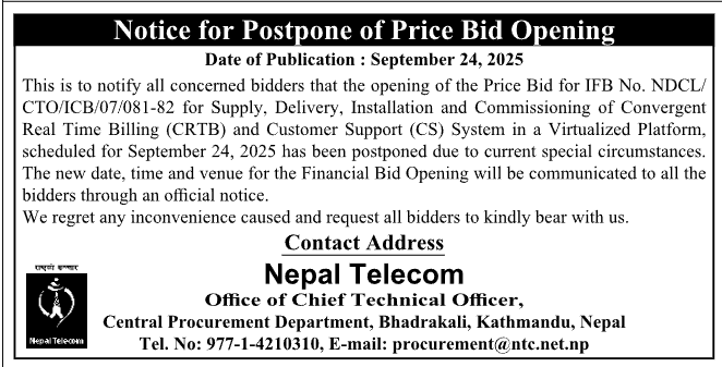 जेनजी आन्दोलनका कारण बुधबार प्रस्तावित मूल्य खोल्ने भनिएको मिति पहिले नै सारिएको थियो । तर, टेलिकमले अर्को सूचना जारी नभएसम्मका लागि मूल्य खोल्ने मिति पुनः स्थगित गरेको टेलिकमले एक सार्वजनिक सूचना जारी गरेर जानकारी दिएको छ ।