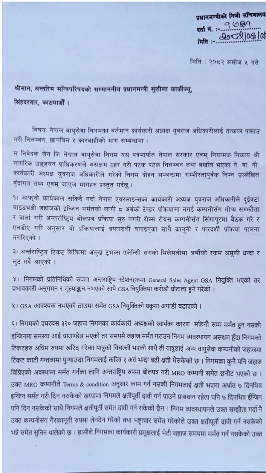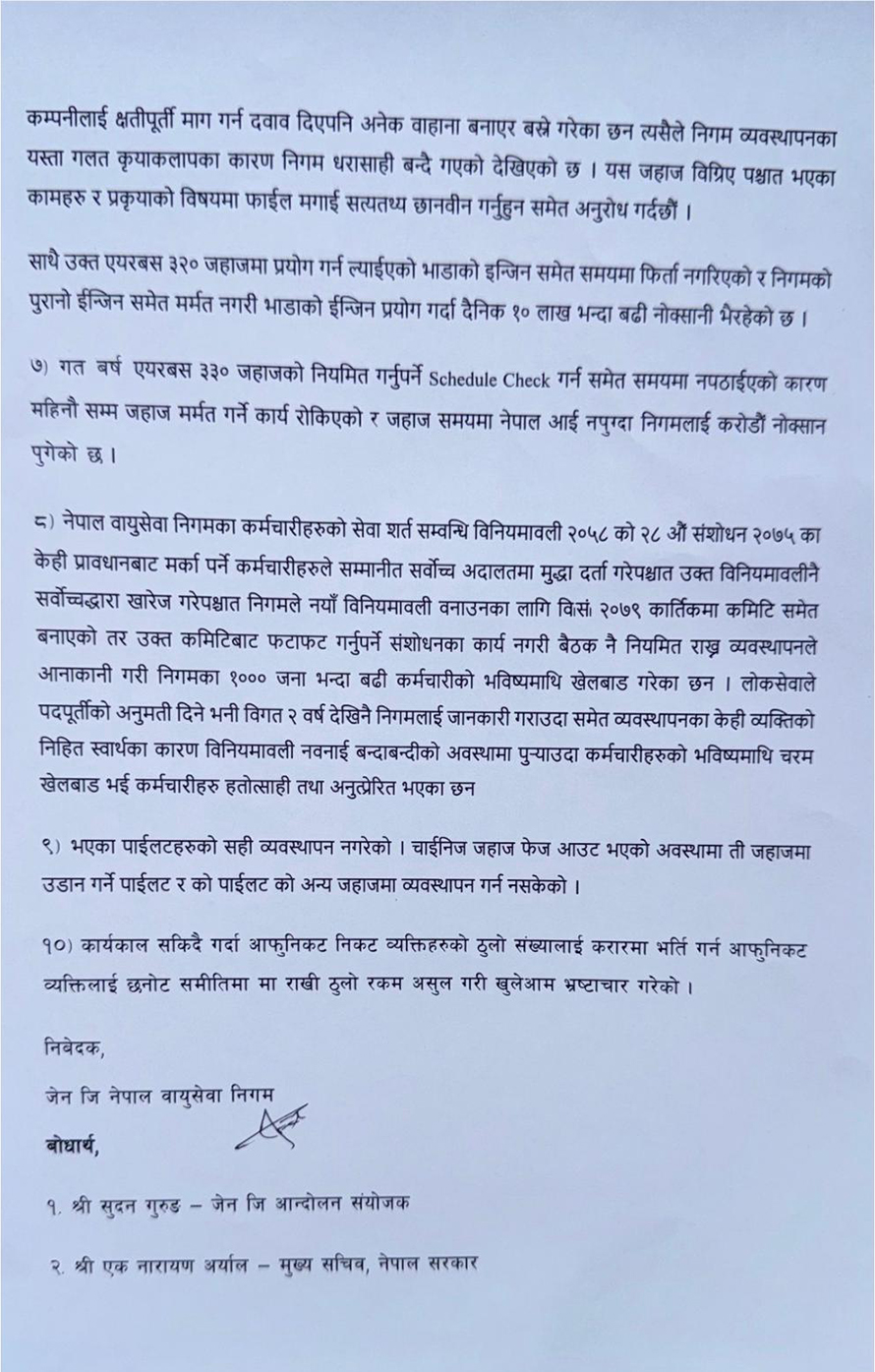 काठमाडौं । नेपाल वायुसेवा निगमका कार्यकारी अध्यक्ष युवराज अधिकारीलाई तत्काल निलम्बन गरी छानबिन र कारबाही गर्न निगमभित्रका जेनजी कर्मचारीले माग गरेका छन् । उनले अनियमितता, लापरबाही र भ्रष्टाचार गरेको भन्दै कर्मचारीले प्रधानमन्त्री सुशीला कार्कीलाई निवेदन दिएका छन् ।