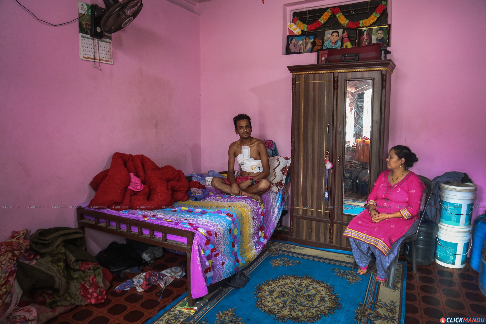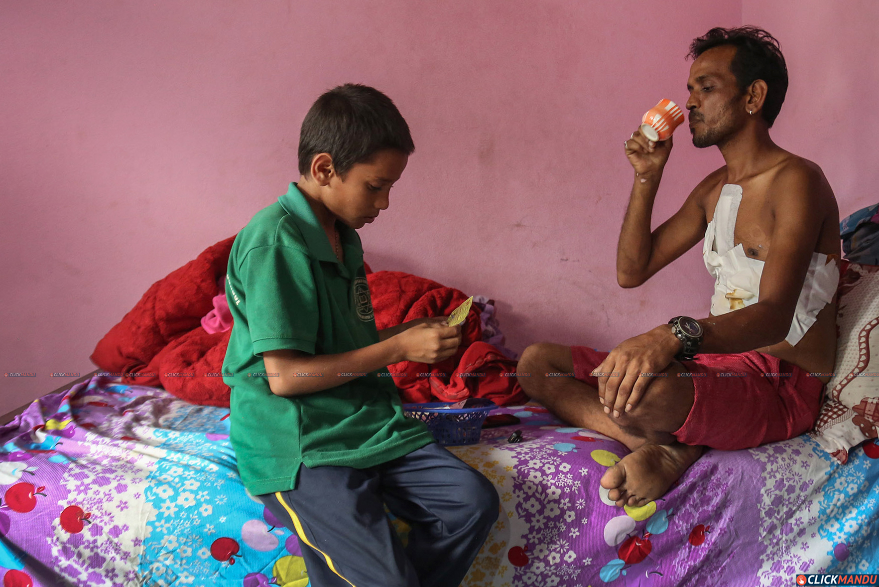 डेढ वर्षअघि श्रीमती गुमाएका अनिल मजदुरी गर्दै कोठा भाडा तिर्थे र आफ्ना नौ वर्षीय छोरालाई पढाइ-लेखाइ गरी हुर्काइरहेका थिए। अहिले भने आफैं घाइते भएपछि दैनिक घर चलाउनसम्म कठिन भएको छ।