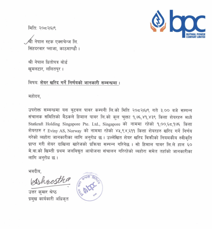 बुटवल पावर कम्पनीको असोज ९ गते बसेको सञ्चालक समितिको बैठकले हिमाल पावरको कुल चुक्ता १ करोड ७६ लख ४१ हजार ४३९ कित्ता सेयर मध्ये स्टाटक्राफ्ट होल्डिङ्स सिंगापुरको नाममा रहेको १ करोड ६८ हजार १७६ कित्ता सेयर र ईभीनी एएस नर्वेको नाममा रहेको ४५ लाख ९४ हजार ६११ कित्ता सेयरहरु खरिद गर्ने निर्णय गरेको हो ।