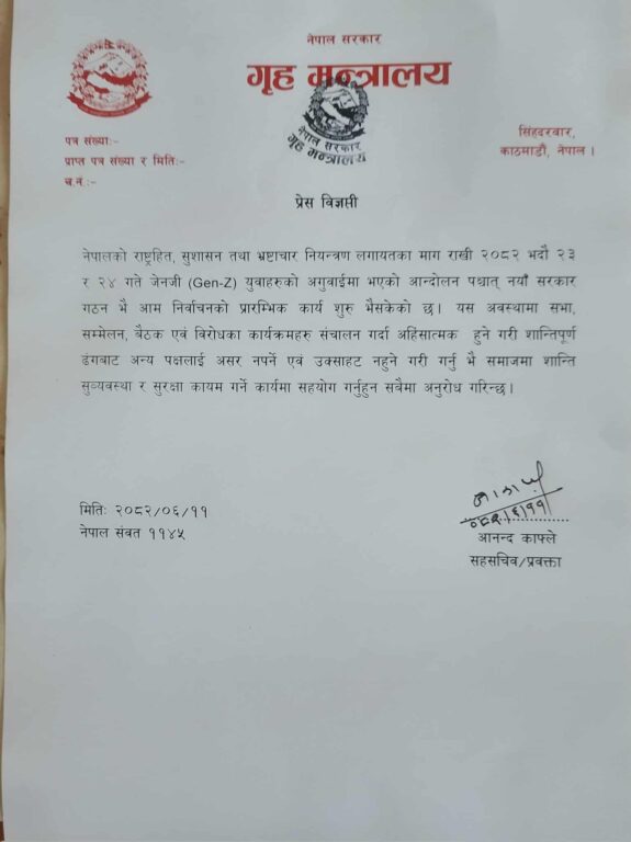काठमाडौं । सरकारले अहिलेको अवस्थामा सभा सम्मेलन र विरोध कार्यक्रम सञ्चालन गर्दा शान्तिपूर्ण र अन्य पक्षलाई उक्साहट नहुनेगरी गर्न अनुरोध गरेको छ ।