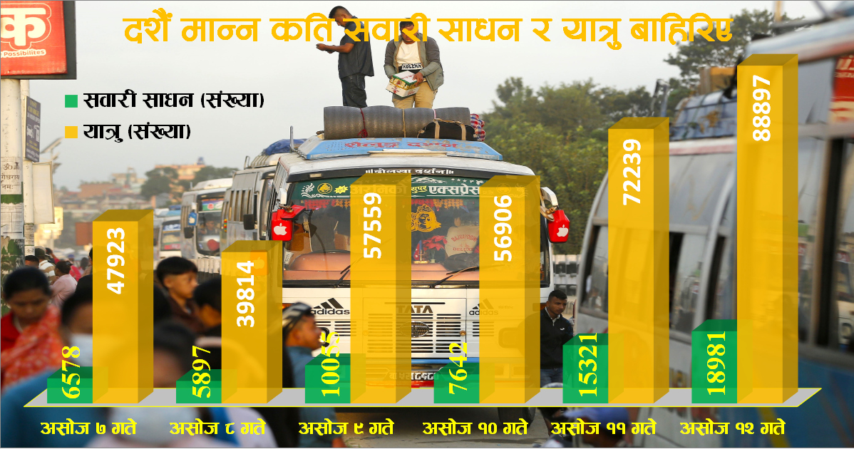 घटस्थापना (असोज ६ गते) देखि आइतबारसम्ममा ६४ हजार ४ सय ७४ सवारी साधनमार्फत ३ लाख ५६ हजार ३ सय ३८ जना यात्रुले उपत्यका छाडेर गृह जिल्ला फर्केका छन् । आइतबार बिहानसम्म ११ स्थानमा सवारी दूर्घटना भएका छन् ।