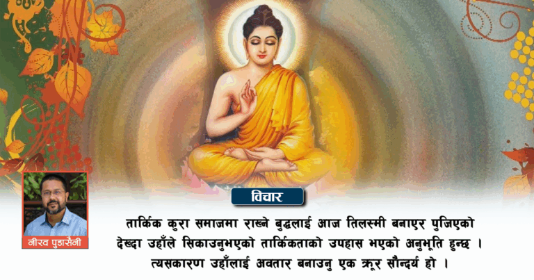 यस्ता तार्किक कुरा समाजमा राख्ने बुद्धलाई आज तिलस्मी बनाएर पुजिएको देख्दा उहाँले सिकाउनुभएको तार्किकताको उपहास भएको अनुभूति हुन्छ । त्यसकारण उहाँलाई अवतार बनाउनु एक क्रूर सौन्दर्य हो । बुद्धको नाममा रुढिवाद, अन्धविश्वास, अतार्किकता र असंगतालाई प्राथमिकता दिएर समाजमा चलाउनु ठूलो अपराध हो । तसर्थ, तार्किक बनौँ, अतार्किक होइन ।