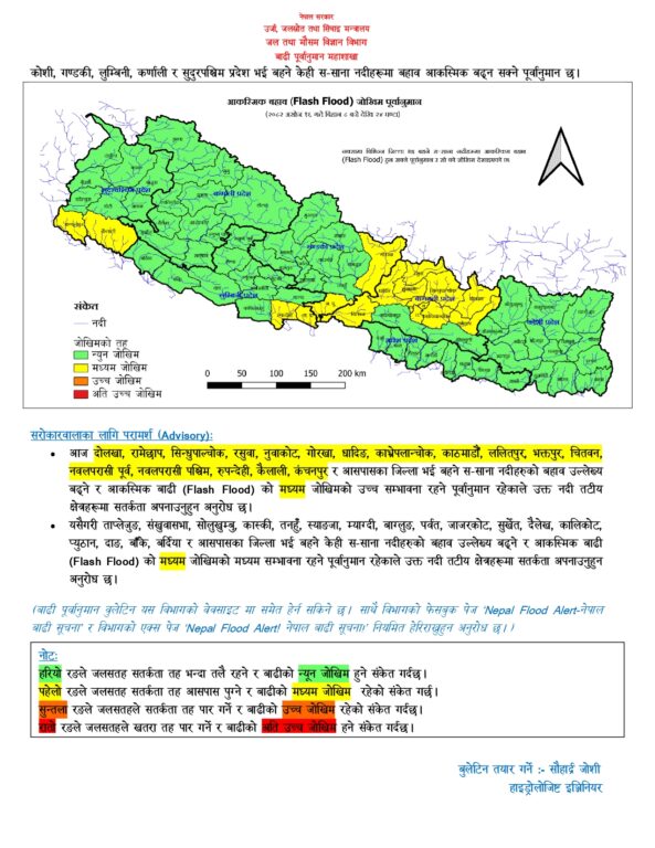 यसैगरी ताप्लेजुङ, संखुवासभा, सोलुखुम्बु, कास्की, तनहुँ, स्याङजा, म्याग्दी, बाग्लुङ, पर्वत, जाजरकोट, सुर्खेत, दैलेख, कालिकोट, प्युठान, दाङ, बाँके, बर्दिया र आसपासका जिल्ला भई वहने केही ससाना नदीको बहाब पनि उल्लेख्य बढ्ने र आकस्मिक बाढीको मध्यम जोखिमको मध्यम सम्भावना छ।