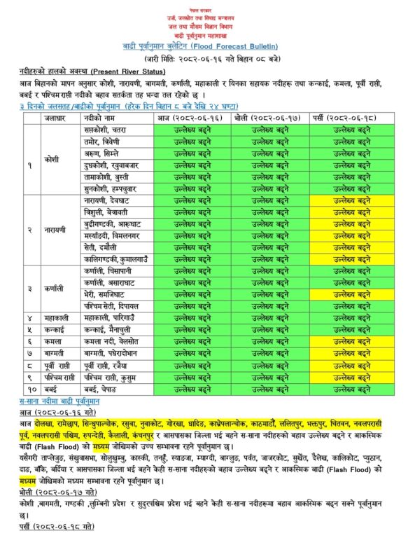 बाढी महाशाखाका अनुसार आज देशका ठूला नदीहरू कोसी, नारायणी, बागमती, कर्णाली, महाकाली र यिनका सहायक नदीहरू तथा कन्काई, कमला, पूर्वी राप्ती, बबई र पश्चिम राप्ती नदीको बहाब उल्लेख्य मात्रामा बढ्ने सम्भावना छ।