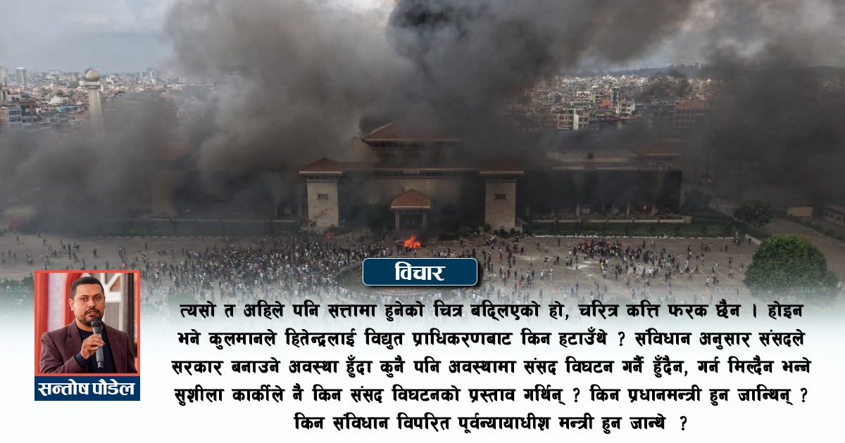 त्यसो त अहिले पनि सत्तामा हुनेको चित्र बद्लिएको हो, चरित्र कत्ति फरक छैन । होइन भने कुलमानले हितेन्द्रलाई विद्युत प्राधिकरणबाट किन हटाउँथे ? किन रातारात छानिछानि कर्मचारी सरुवा गर्थे । संविधान अनुसार संसदले सरकार बनाउने अवस्था हुँदा कुनै पनि अवस्थामा संसद विघटन गर्नै हुँदैन, गर्न मिल्दैन भन्ने सुशीला कार्कीले नै किन संसद विघटनको प्रस्ताव गर्थिन् ? किन प्रधानमन्त्री हुन जान्थिन् ? किन संविधान विपरित पूर्वन्यायाधीश मन्त्री हुन जान्थे ? किन पहिल्यै सामाजिक सञ्जालमा फैसला सुनाइसकेका व्यक्तिलाई न्यायिक छानबिन समितिको जिम्मा दिइन्थ्यो ?
