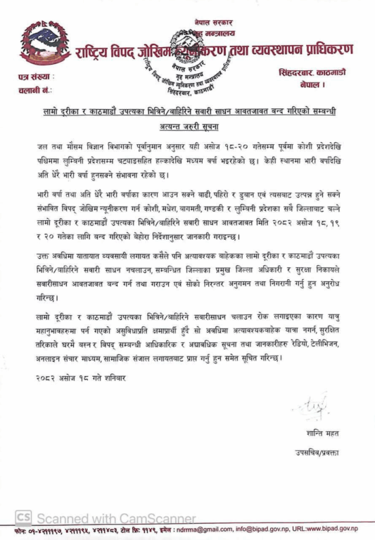 यसैबीच राष्ट्रिय विपद् जोखिम न्यूनिकरण तथा व्यवस्थापन प्राधिकरणले काठमाडौंबाट बाहिरिने र बाहिरी जिल्लाबाट भित्रिने लामो दूरीका सवारी साधनको आवत जावतमा रोक लगाएको छ ।