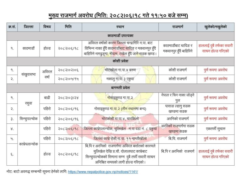 काठमाडौं । शुक्रबार साँझदेखि परिरहेका अविरल वर्षाका कारण हुन सक्ने जोखिमलाई ध्यानमा राख्दै देशभरका प्रमुख राजमार्गहरूमा शनिबार बिहानदेखि सवारी साधन होल्ड गर्न लागिएको छ ।