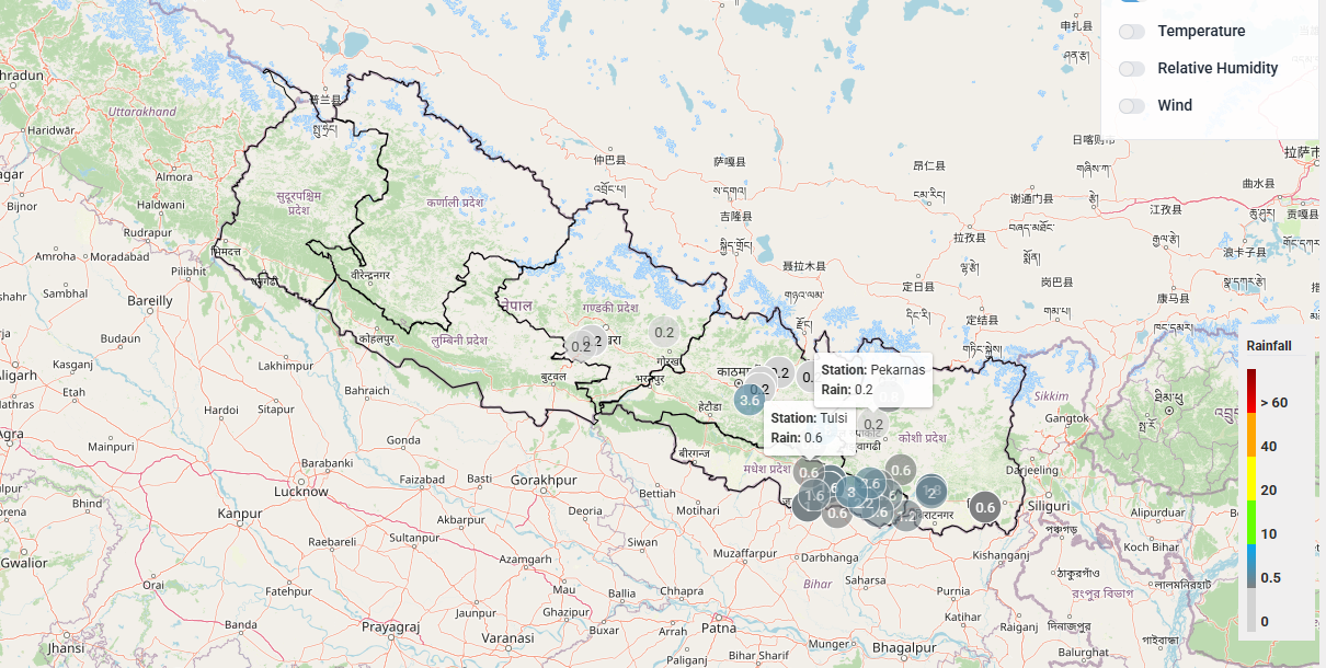 ललितपुरको खुमलटार जलमापन केन्द्रका अनुसार पछिल्लो १ घण्टामा उक्त क्षेत्रमा ३.६ मिलिलिटर पानी परेको छ । त्यस्तै सुन्दरीजलमा ०.२ मिलिलिटर, धापड्याममा ०.२ र सिन्धुपाल्चोकको तलामाराङ जल मापन केन्द्रमा ०.२ मिलिलिटर वर्षा मापन भएको छ । त्यस्तै गौरीशंकर संरक्षण क्षेत्रमा पनि सामान्य वर्षा भएको छ । रामेछापको मन्थली विमानस्थल क्षेत्रमा ६.८ मिलिलिटर वर्षा मापन भएको छ भने सिन्धुलीगढीमा ०.८ मिलिलिटर पानी परेको छ ।