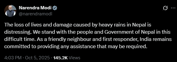 सामाजिक सञ्जाल एक्समा आइतवार पोस्ट गर्दै मोदीले यस कठिन घडीमा आफूहरू नेपाली जनता र नेपाल सरकारसँग उभिएको बताए ।
