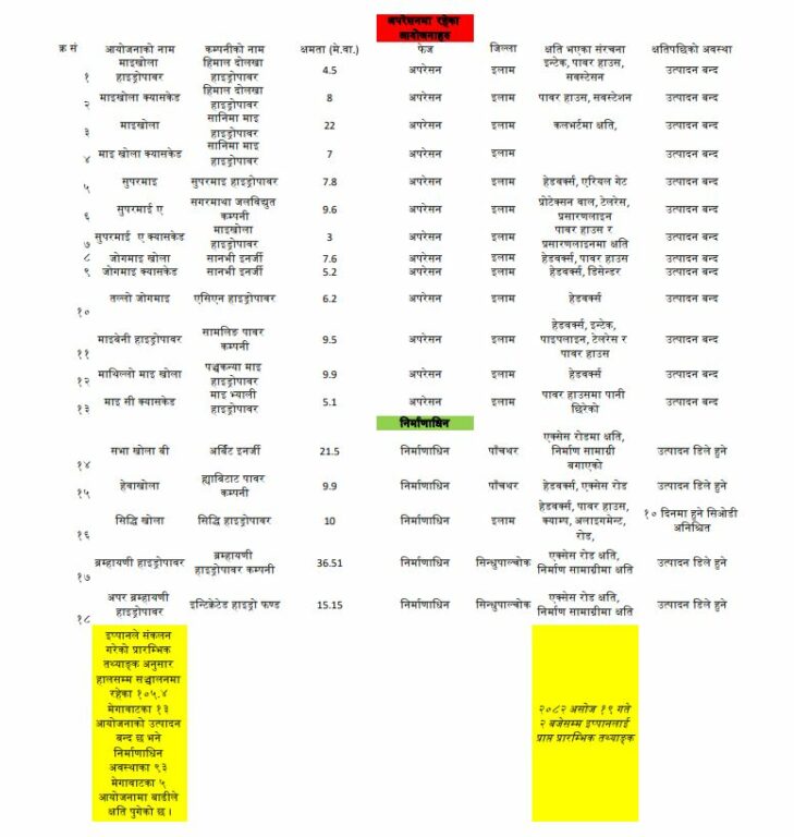 मन्त्रालयका अनुसार इलामको ४.५ मेगावाटको माइखोला हाइड्रोपावर, ८ मेगावाटको माइखेला क्यासकेड, २२ मेगावाटको माइखोला, ७ मेगावाटको माइखोला क्यासकेड, ७.८ मेगावाटको सुपरमाई, ९.६ मेगावाटको सुपरमाई ए, ३ मेगावाटको सुपरमाई एक क्यासकेड र ७.६ मेगावाटको जोगमाई खोला जलविद्युत आयोजनाको उत्पादन बन्द भएको छ ।