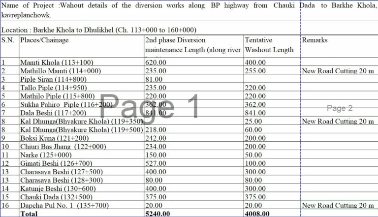 बिपी राजमार्गको चौकीडाँडादेखि बर्खेखोला सम्मको १६ स्थानमा ४ किलोमिटर ८ मिटर खण्ड बाढी र पहिरोले डाइभर्सन जगदेखि नै बगाएको छ । यसमध्ये १४ स्थान भक्तपुर–काभ्रेपलाञ्चोक डिभिजन कार्यालयअन्तर्गत परेका छन् भने २ स्थान सिन्धुली–रामेछाप (खाल्टे) डिभिजन कार्यालय अन्तर्गत पर्छ ।