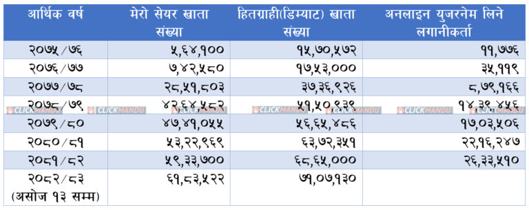 २०७९/८० को अन्त्यमा मेरो सेयर खाता लिनेको संख्या ४७ लाख ४१ हजार ५५ रहेकोमा आर्थिक वर्ष २०८०/८१ मा उक्त संख्या बढेर ५३ लाख २२ हजार ९ सय ६९ पुगेको थियो । यसबाट थप बढ्दै गत आर्थिक वर्ष २०८१/८२ मा आइपुग्दा उक्त संख्या बढेर ५९ लाख ३३ हजार ७ सय भन्दा बढी पुग्यो ।