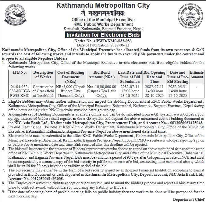 बालेन्द्र शाह मेयर रहेको महानगरपालिकाले टुँडिखेलमा घाँसेमैदान बनाउने ठेक्का खुलाएको छ । जसका लागि विद्युतीय कबोल माग गरिएको छ ।