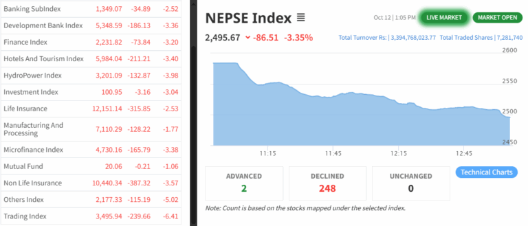 काठमाडौं । आइतबार कारोबार खुलेदेखि नै सेयर बजार निरन्तर घटिरहेको छ । साताको कारोबारको पहिलो दिन आइतबार दिउँसो १ बजेर ५ मिनेट सम्ममा सेयर बजार सूचक नेपाल स्टक एक्सचेञ्ज (नेप्से) ८६.५१ अंकले घटेर २४९५.६७ बिन्दुमा खुम्चिएको छ ।