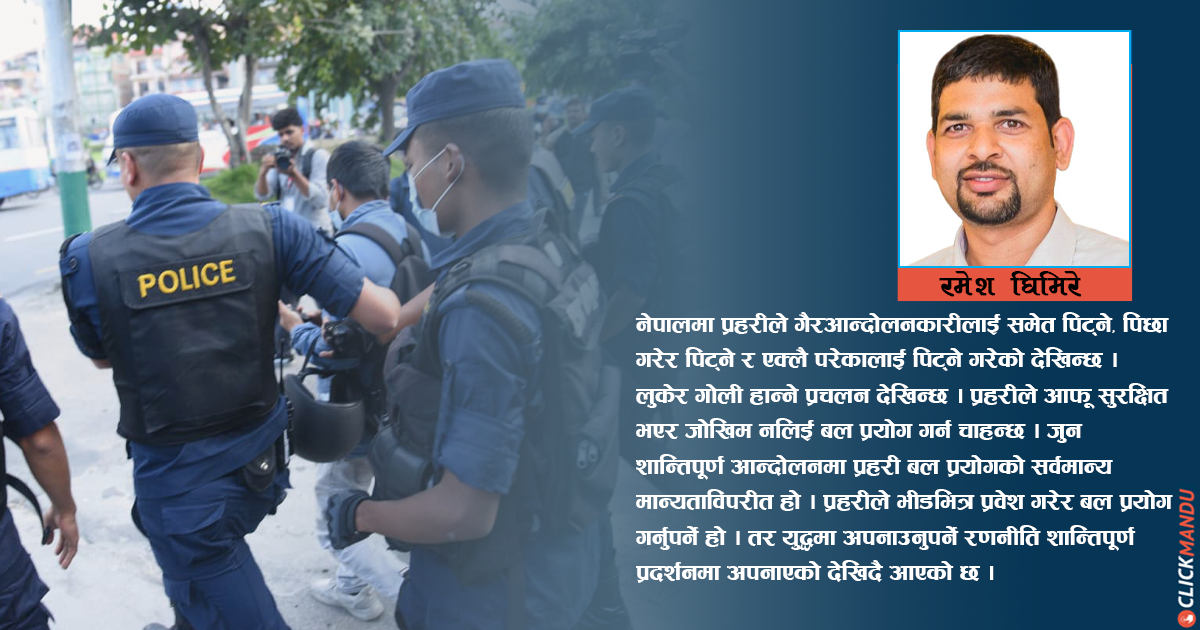 नेपालमा प्रहरीले गैरआन्दोलनकारीलाई समेत पिट्ने, पिछा गरेर पिट्ने र एक्लै परेकालाई पिट्ने गरेको देखिन्छ । लुकेर गोली हान्ने प्रचलन देखिन्छ । प्रहरीले आफू सुरक्षित भएर जोखिम नलिई बल प्रयोग गर्न चाहन्छ । जुन शान्तिपूर्ण आन्दोलनमा प्रहरी बल प्रयोगको सर्वमान्य मान्यताविपरीत हो । प्रहरीले भीडभित्र प्रवेश गरेर बल प्रयोग गर्नुपर्ने हो । तर युद्धमा अपनाउनुपर्ने रणनीति शान्तिपूर्ण प्रदर्शनमा अपनाएको देखिंदै आएको छ ।