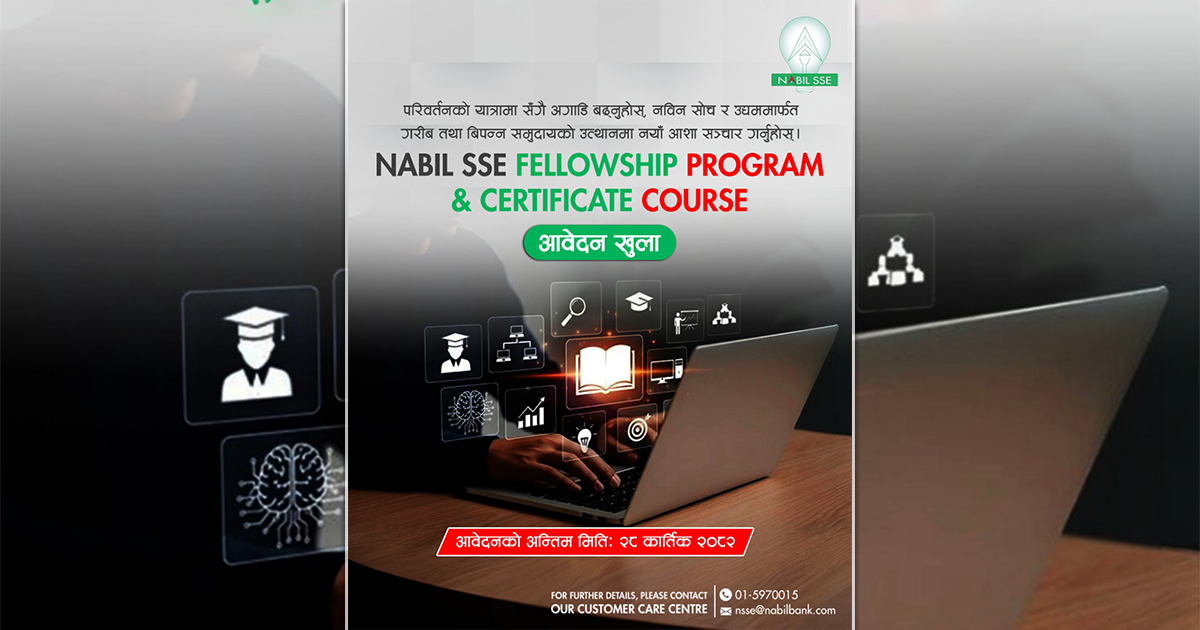 काठमाडौं । नबिल बैंकले नबिल स्कुल अफ सोसल इन्टरप्रेनरसिप (नबिल एसएसई) अन्तर्गत फेलोसिप र सर्टिफिकेट कोर्सको नयाँ समूहका लागि आवेदन आह्वान गरेको छ ।