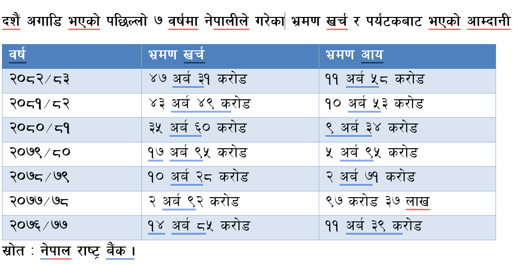 तथ्यांक अनुसार नेपालीले यो वर्ष दशैं अगाडि नै विदेश घुमघाम गर्दा ४७ अर्ब रुपैयाँ सकेका छन् । यस्तो खर्च अघिल्लो वर्ष २०८१/८२ को पहिलो २ महिनामा ४३ अर्ब ४९ करोड रुपैयाँ रहेको तथ्यांकले देखाएको छ । गत वर्षको सोही अवधिमा नेपालमा पर्यटक आउँदा भएको आम्दानी जम्मा १० अर्ब ५३ करोड रुपैयाँ मात्रै छ ।