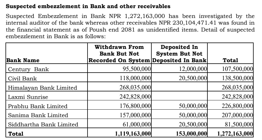 बैंकमा बहालवाला र पूर्व व्यवस्थापक तथा सञ्चालकको शंकास्पद वित्तीय अनियमितता १ अर्ब ५० करोड २२ लाख ६७ हजार रुपैयाँ भएको अनुमान गरिएको छ । उक्त रकम बराबरको हिनामिना तथा अनधिकृत वित्तीय कारोबार पहिचान भएको र त्यसले बैंकको वित्तीय अवस्थामा गम्भीर असर पारेको प्रतिवेदनमा उल्लेख छ ।