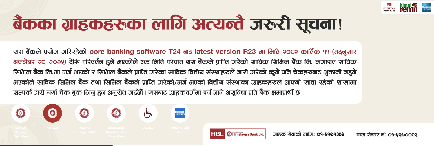 बैंकले प्रयोग गरिरहेको कोर बैंकिङ सफ्टवेयर कात्तिक ११ देखि टी–२४ रिलिज आर–२३ मा स्तरोन्नति हुने भएको हुँदा उक्त मिति पश्चात् बैंकले प्राप्ति गरेको साविक सिभिल बैंक लगायत साविक सिभिल बैंक मर्ज भएका र सिभिल बैंकले प्राप्ति गरेका साविक वित्तीय संस्थाहरुले जारी गरेको कुनै पनि चेकहरुबाट भुक्तानी नहुने भएकोले सिभिल बैंक तथा सिभिल बैंकले प्राप्ति गरेकोरमर्ज भएको वित्तीय संस्थाका ग्राहकहरुले आफ्नो खाता रहेको शाखामा सम्पर्क गरी नयाँ चेक बुक लिन पनि बैंकले आग्रह गरेको छ ।