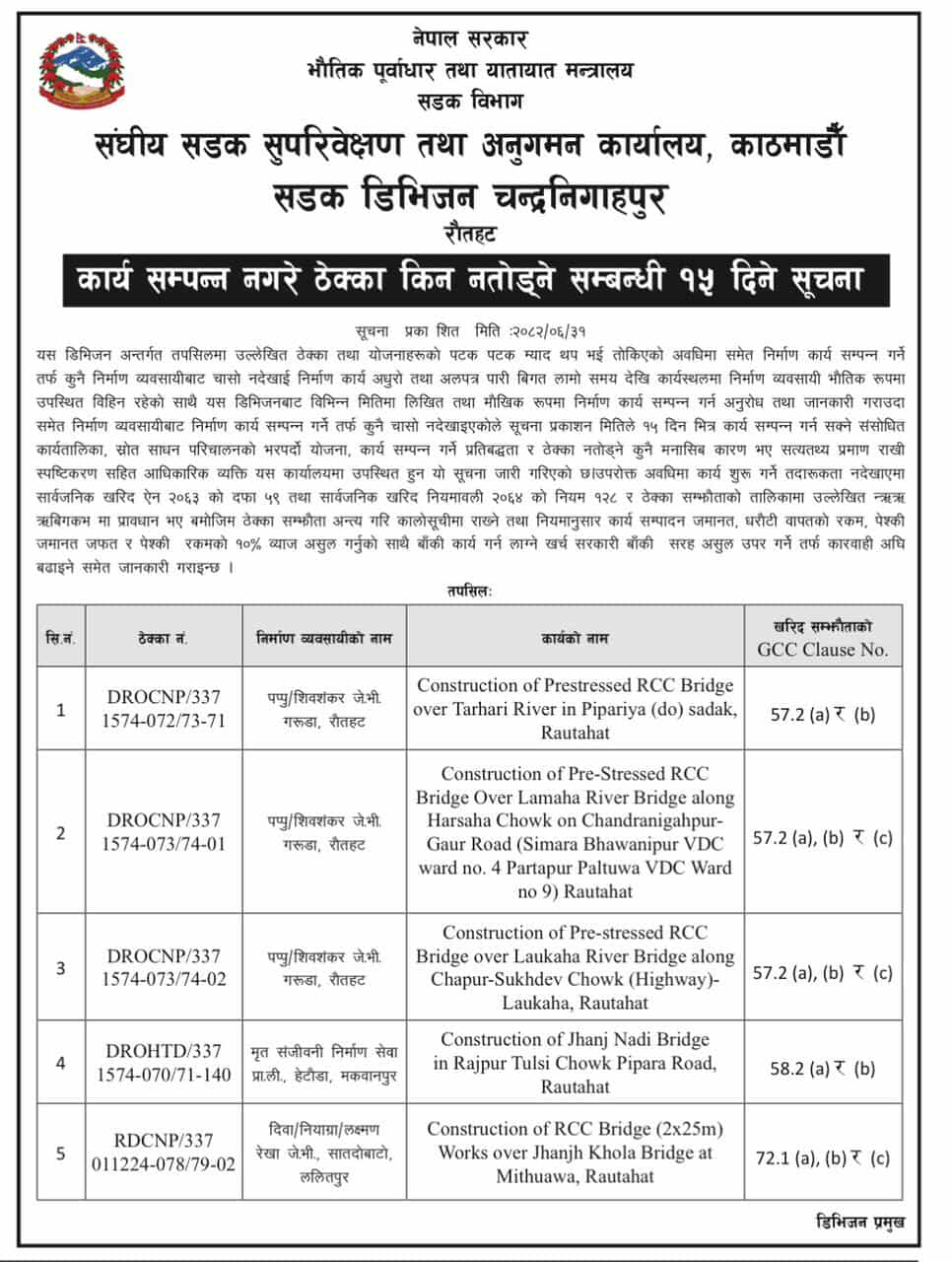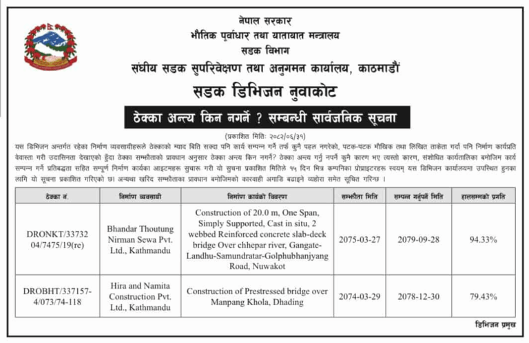 सडक डिभिजन कार्यालय विराटनगर, चन्द्रनिगाहपुर तथा निर्देशनालयले पाँच/पाँच र नुवाकोटले २ वटा गरी १७ वटा ठेक्का किन नतोड्ने ? भन्दै शुक्रबार सार्वजनिक सूचना जारी गरेका छन् । ठेक्का तोड्न प्रक्रिया बढाइएका अधिकांश पुल निर्माणका रहेका छन् ।
