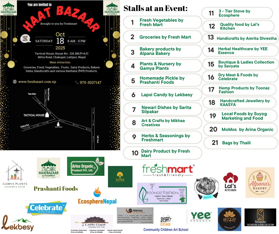 बजारमा बिभिन्न २१ वटा स्टल राखिने आयोजकको भनाइ छ । जसमा फ्रेशमार्ट सहित १८ वटा कम्पनीका सामाग्री हुनेछन् र यस अघि अनलाईन मार्फत मार्टले सामान बिक्रि गर्दै आएकोमा यस पश्चात भौतिक रुपमा समेत सामान बिक्रि गर्ने तयारी रहेको छ ।