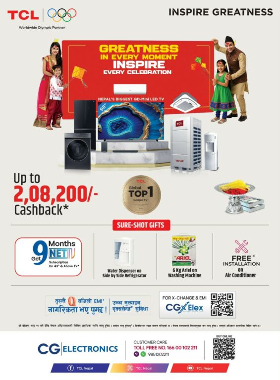 काठमाडौं । चाडपर्वको अवसरमा टीसीएलले आफ्ना ग्राहकहरूका लागि आकर्षक अफर घोषणा गरेको छ । कम्पनीले ‘हरेक क्षणमा महानता, प्रत्येक उत्सवमा प्रेरणा’ भन्ने नाराका साथ नेपालमा एलईडी, टेलिभिजन सहित विभिन्न घरायसी उपकरणहरु विशेष योजना ल्याएको छ ।