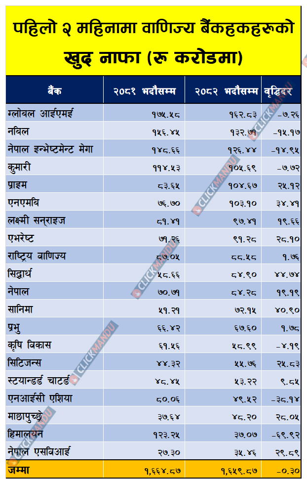 नेपाल राष्ट्र बैंकले सार्वजनिक गरेको चालु आर्थिक वर्ष २०८२/८३ को तथ्यांक अनुसार वाणिज्य बैंकहरुले १६ अर्ब ५९ करोड ८७ लाख रुपैयाँ नाफा कमाएका छन् ।