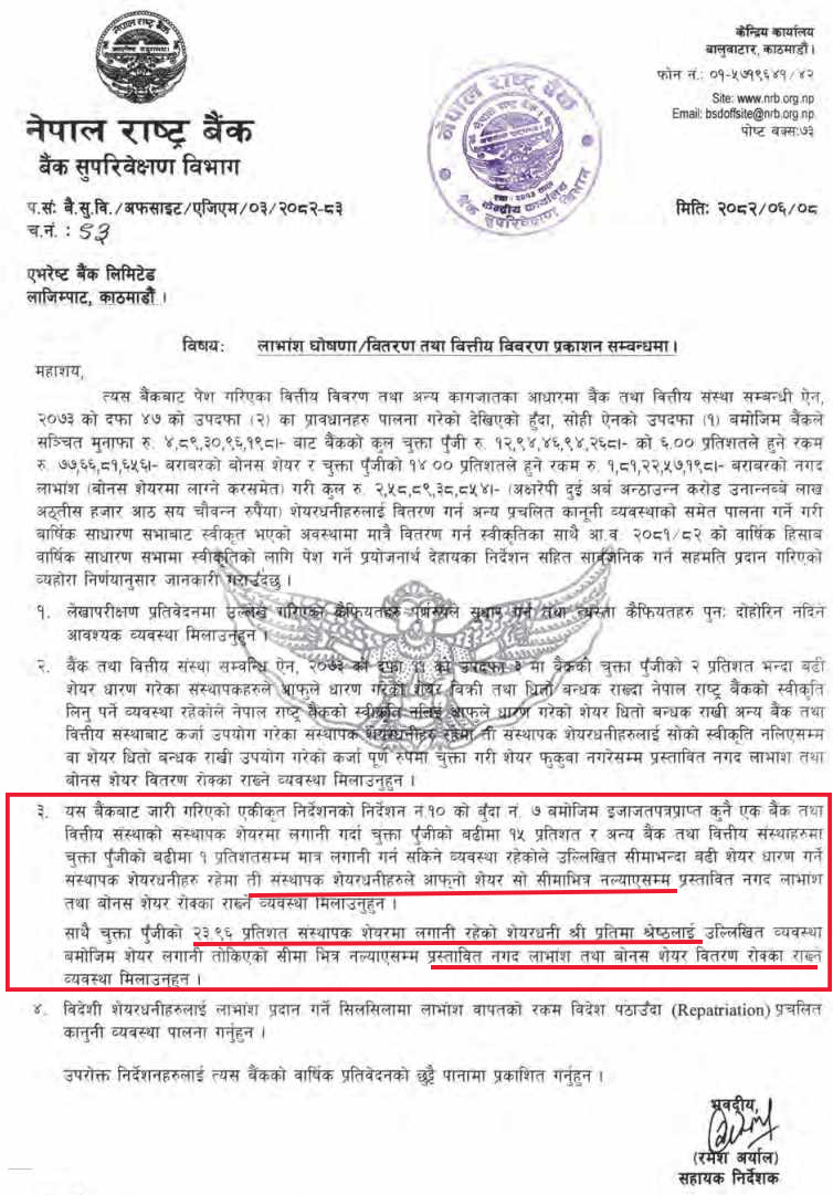 नेपाल राष्ट्र बैंकले एभरेष्ट बैंकलाई एजीएम क्लियरेन्स दिने क्रममा प्रतिमाले स्वामित्व घटाएर १५ प्रतिशतमा सीमित नगरेसम्म लाभांश नदिन बैंकलाई निर्देशन दिएको हो ।