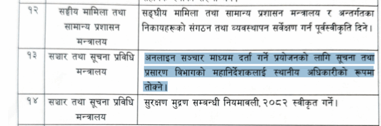 असोज ९ गते बसेको मन्त्रिपरिषद् बैठकले अनलाइन सञ्चारमाध्यमको दर्ता तथा नविकरण सूचना तथा प्रशारण विभागबाटै हुने निर्णय गरेको भएपनि हालसम्म कार्यान्वयनमा आउन नसकेको हो ।