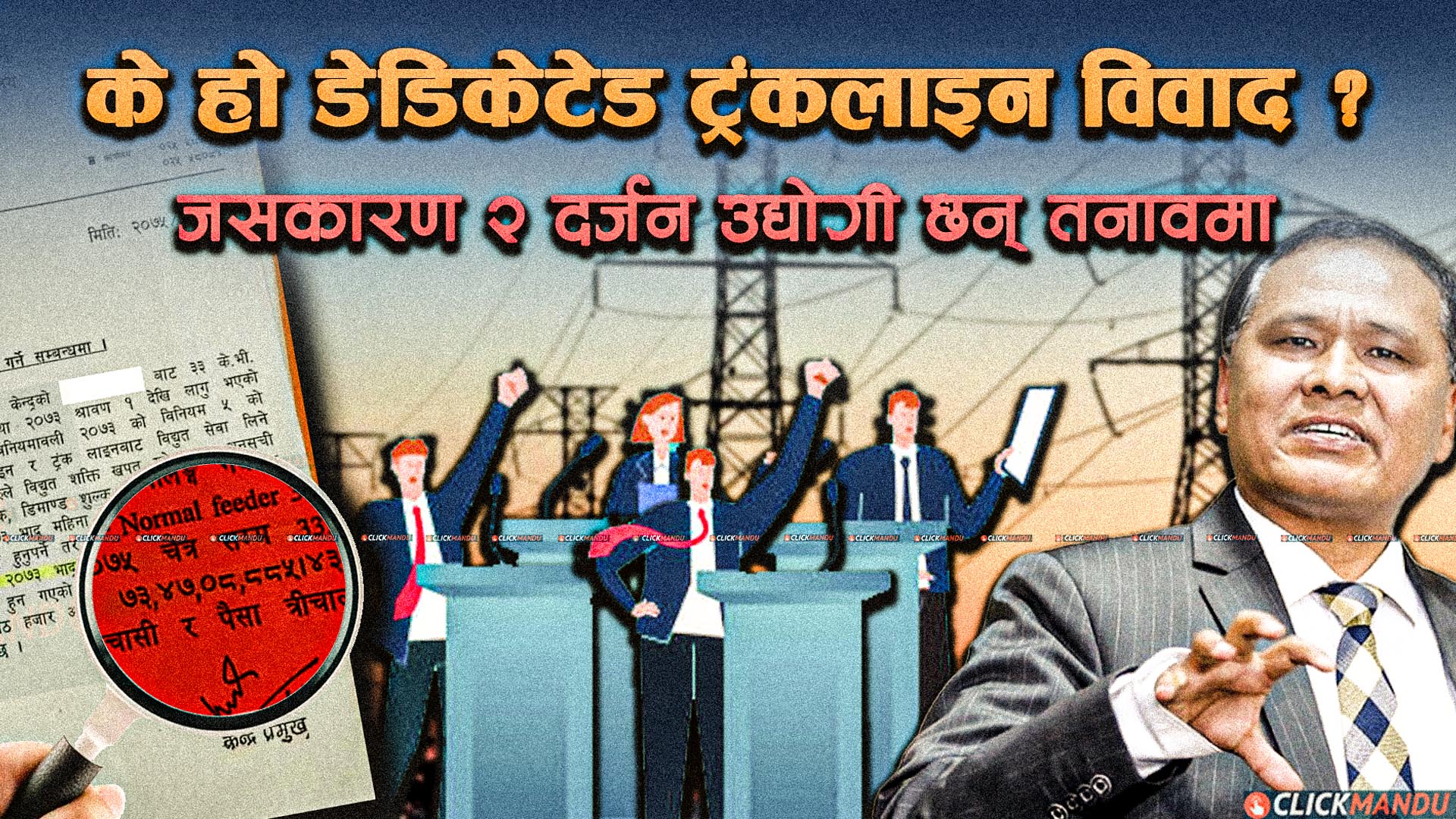 चलाइरहेको बिजुली एकैचोटी काटिए पछि यतिबेला देशका २ दर्जन उद्योगी तनावमा छन् । एकातर्फ नेपाल विद्युत प्राधिकरण र ऊर्जामन्त्री जसरी पनि डेडिकेटेड ट्रंकलाइनको बक्यौता उठाएरै छाड्ने अड्डी कसेर बसेका छन् भने अर्कोतर्फ उद्योगी तिर्नै नपर्ने पैसा किन तिर्ने ? भन्ने अडानमा छन् ।