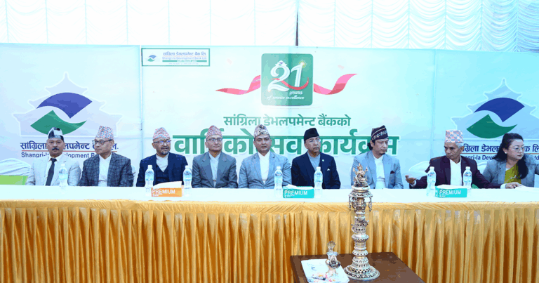 काठमाडौं । सांग्रिला डेभलपमेन्ट बैंकले आफ्नो २१ औं वार्षिकोत्सव मनाएको छ । वार्षिकोत्सवको अवसरमा बिहीबार बैंकको केन्द्रीय कार्यालय बालुवाटारमा एक कार्यक्रम आयोजना गरिएको थियो ।