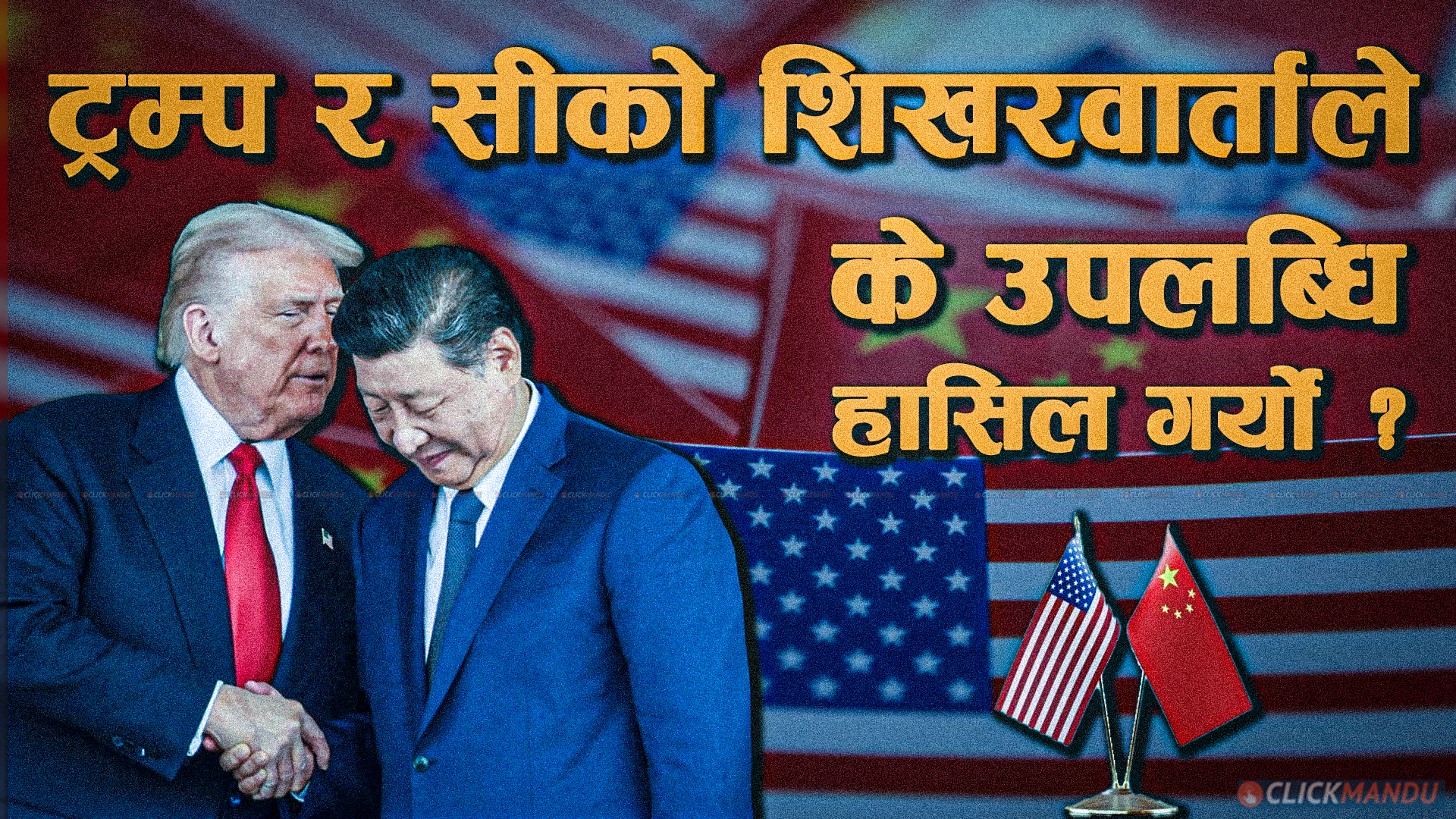 काठमाडौं । दुई ठूला अर्थतन्त्र अमेरिका र चीनबीच लामो समयदेखिको व्यापार तनाव कम गर्ने उद्देश्यले अमेरिकी राष्ट्रपति डोनल्ड ट्रम्प र चिनियाँ राष्ट्रपति सी चिनपिङबीच दक्षिण कोरियाको बुसानमा करिब डेढ घण्टा भेटवार्ता सम्पन्न भएको छ ।