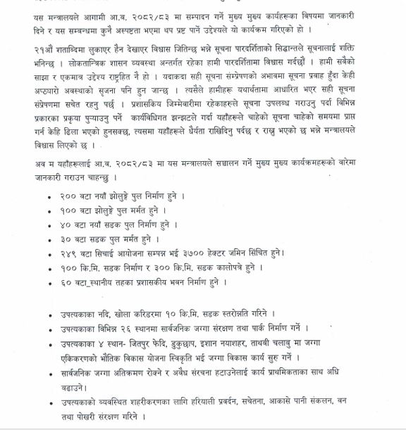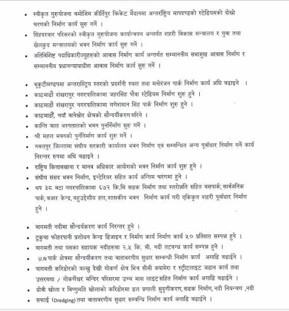 यस्तै १ सय किलोमिटर सडक निर्माण र ३ सय किलोमिटर सडक कालोपत्रे गर्ने, ६० वटा स्थानीय तहका प्रशासकीय भवन स्तरोन्नती गर्ने, उपत्यका नदी, खोला कोरिडरमा १० किलोमिटर सडक स्तरोन्न्ती गर्ने, उपत्यकाको विभिन्न २६ स्थानमा सार्वजनिक जगगा संरक्षण तथा पार्क निर्माण गर्ने, उपत्यकाका ४ स्थान जितपुर फेदी, डुकुछाप, इशान नयाँ शहर, ताथवी चलाबुमा जग्गा एकीकरणको भौतिक विकास योजना, सार्वजनिक जग्गा अतिक्रमण रोक्ने र अवैद्य संरक्षचना हटाउने कार्यक्रम पनि प्राथमिकतामा परेको थियो ।