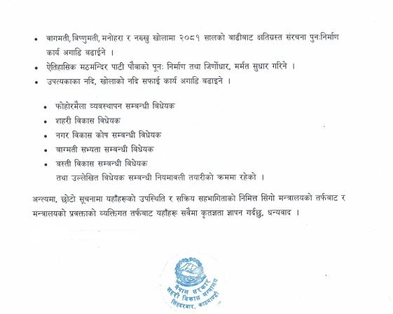 बागमती नदीमा सौन्दर्यीकरण, टुकुचा फोहोरपानी प्रशोधन केन्द्र डिजाइन र निर्माण, बागमती तथा सहायक नदीमा तटवन्द निर्माण, युएन पार्क क्षेत्रमा सौन्दर्यीकरण र वातावरण सुधार, बागमती कोरिडरको बल्खुदेखि गोकर्ण क्षेत्रसम्म सीसी क्यामेरा र स्ट्रीट लाइट जडान, उत्तरगया, गोकर्णेश्वर मन्दिर परिसरमा मास लाइट निर्माण, खोवी खोला र बिष्णुमति खोला कोरिडर सुधार, बागमती, बिष्णुमति, मनोहरा र नख्खु खोलाको संरचना सुधारलगायतको योजना शहरी विकास मन्त्रालयले चालु आर्थिक वर्षमा सञ्चालनमा ल्याउने भनेर प्राथमिकतामा राखेको थियो ।