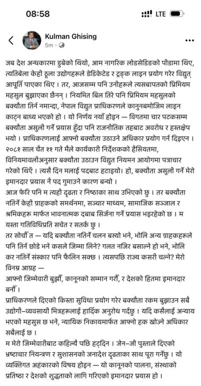 २०८१ चैत ११ गते विनियमावलीअनुसार बक्यौता उठाउन विद्युत् नियमन आयोगमा पत्राचार गर्दा त्यही दिन आफूलाई निर्देशक पदबाट हटाइएको स्मरण गर्दै घिसिङले आज फेरि आफू त्यही दृढता र निष्ठाका साथ उभिएको उल्लेख गरेका छन्।