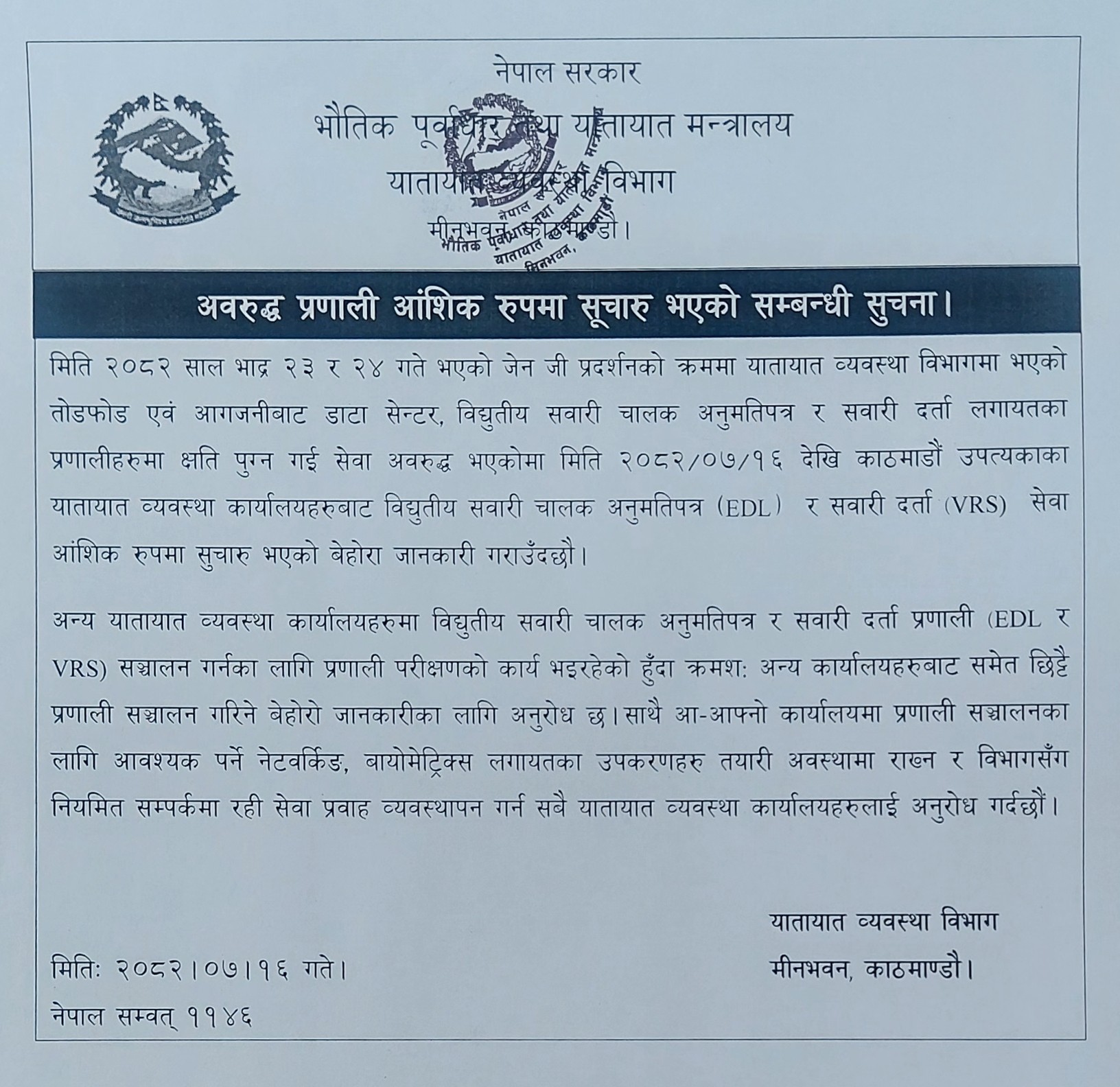 गत भदौं २३ र २४ गते भएको जेनजी आन्दोलनको क्रममा यातायात व्यवस्था विभागमा भएको तोडफोड र आगजनीका कारण डाटा सेन्टर, विद्युतीय सवारी चालक अनुमति पत्र र सवारी दर्तालगायतका प्रणालीमा क्षति पुगेको थियो ।