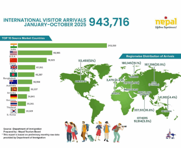 काठमाडौं । नेपालमा सन् २०२५ को पहिलो १० महिनामा ९ लाख ४३ हजार ७१६ जना पर्यटक भित्रिएका छन् । नेपाल पर्यटन बोर्डले सार्वजनिक गरेको अध्यागमन विभागको तथ्यांक अनुसार नेपाल आउने पर्यटक अक्टोबरमा मात्रै १ लाख २८ हजार ४४३ जना छन् ।