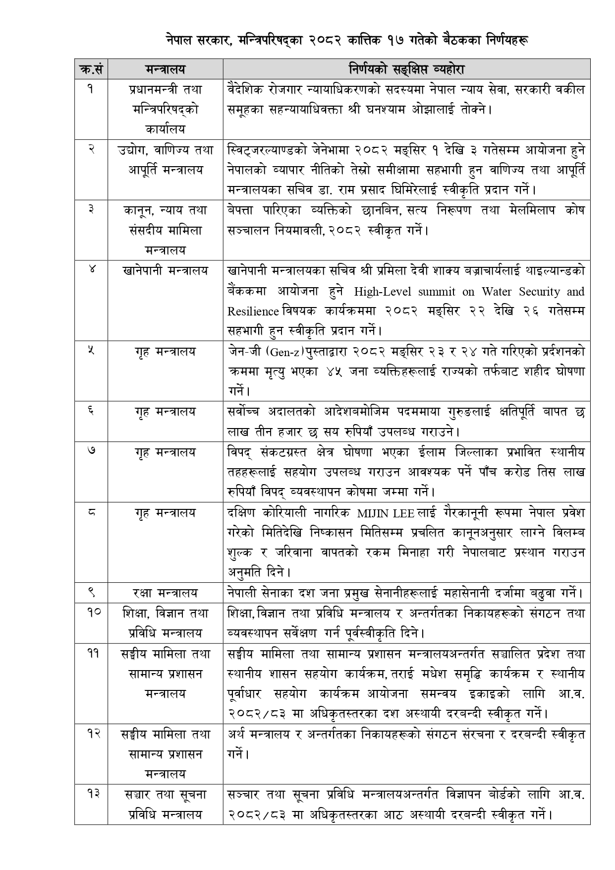 सोमबार सिंहदरबारमा बसेको मन्त्रिपरिषद्को बैठकले योसहित १३ निर्णय गरेको हो।