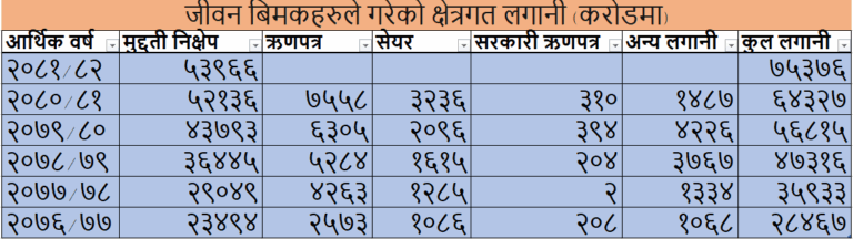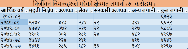 प्राधिकरणको तथ्यांकअनुसार आर्थिक वर्ष २०७६/७७ देखि २०८१/८२ सम्मको अवधिमा जीवन तथा निर्जीवन बिमा कम्पनीहरुले गरेको लगानी मुद्दती निक्षेपमै बढी केन्द्रीत भएको देखिन्छ । आर्थिक वर्ष २०७६/७७ सम्म जीवन बिमा कम्पनीहरुले २ खर्ब ८४ अर्ब ६७ करोड रुपैयाँ कुल लगानी गरेका थिए, जुन बेला कुल लगानीको ८२.५३ प्रतिशत अर्थात् २ खर्ब ३४ अर्ब ९४ करोड लगानी मुद्दती निक्षेपमा भएको थियो ।
