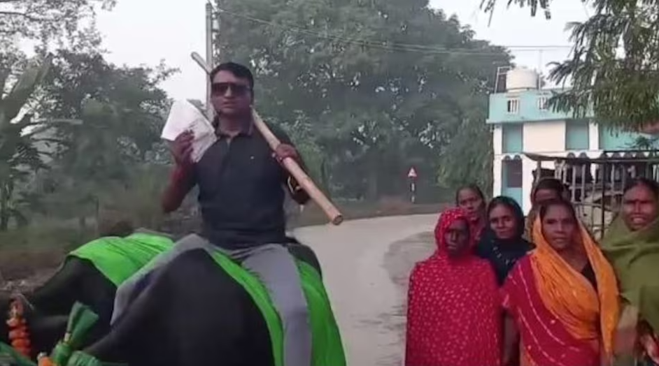 बिहार विधानसभा निर्वाचन : भैंसी चढेर मतदान गर्न पुगे यी व्यक्ति
