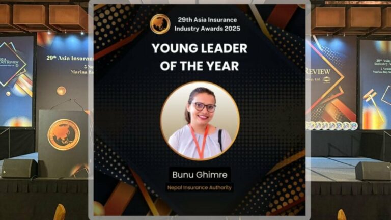 काठमाडौं । सिंगापुरस्थित म्यारिना बे स्यान्ड्स एक्स्पो एण्ड कनभेन्सन सेन्टरमा भएको २९औँ एशिया इन्स्योरेन्स इन्डस्ट्री अवाड्र्समा नेपालकी बुनु घिमिरे ‘योङ लिडर अफ दि इयर’ उपाधि प्राप्त गरिन् । सन् २०२५ नोभेम्बर ३ मा भएको अवार्ड घोषणा कार्यक्रममा नेपाल बिमा प्राधिकरणकी सहायक निर्देशक (कानूनी) बुनु घिमिरेले उक्त उपाधि प्राप्त गरेकी हुन् ।