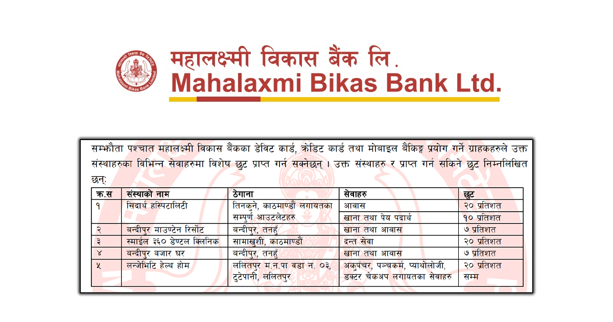 महालक्ष्मी विकास बैंकका डेबिट कार्ड, क्रेडिट कार्ड तथा मोबाइल बैंकिङ प्रयोग गर्ने ग्राहकहरुले विभिन्न सेवामा विशेष छुट प्राप्त गर्न सक्नेछन् । छुट पाउन डेबिट कार्ड, क्रेडिट कार्ड तथा मोबाइल बैंकिङ प्रयोग गरी भुक्तानी गर्नुपर्नेछ ।